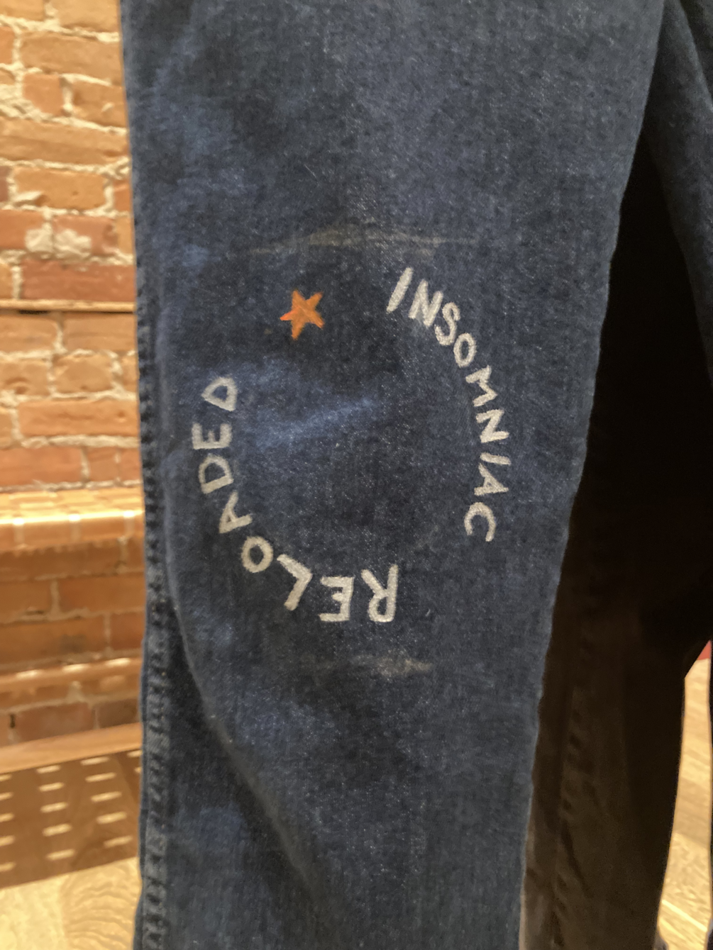 These hand painted Insomniac: Reloaded straight leg Jeans!!!! These are amazing, and circle right around the knee. Absolutely Timeless!!! Oh also, those lines are left over from our chalk marks for placement lol, the first wash will take them right out!